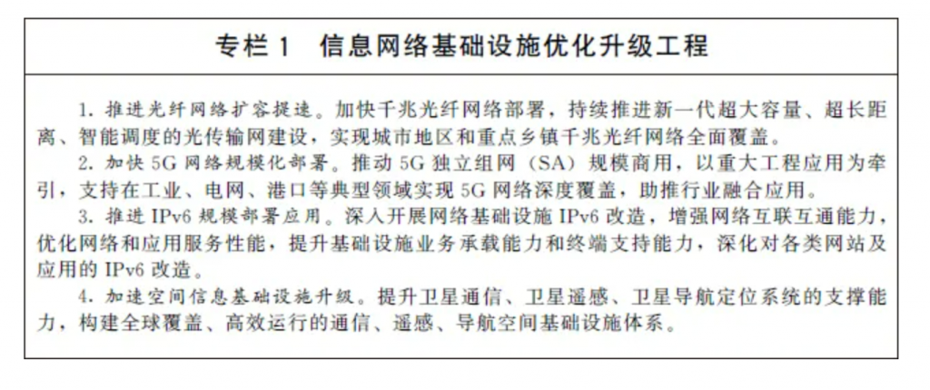 (一)加快建设信息网络基础设施。建设高速泛在、天地一体、云网融合、智能敏捷、绿色低碳、安全可控的智能化综合性数字信息基础设施。有序推进骨干网扩容,协同推进千兆光纤网络和5G网络基础设施建设,推动5G商用部署和规模应用,前瞻布局第六代移动通信(6G)网络技术储备,加大6G技术研发支持力度,积极参与推动6G国际标准化工作。积极稳妥推进空间信息基础设施演进升级,加快布局卫星通信网络等,推动卫星互联网建设。提高物联网在工业制造、农业生产、公共服务、应急管理等领域的覆盖水平,增强固移融合、宽窄结合的物联接入能力。