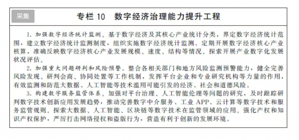 ——数字经济治理体系更加完善。协调统一的数字经济治理框架和规则体系基本建立,跨部门、跨地区的协同监管机制基本健全。政府数字化监管能力显著增强,行业和市场监管水平大幅提升。政府主导、多元参与、法治保障的数字经济治理格局基本形成,治理水平明显提升。与数字经济发展相适应的法律法规制度体系更加完善,数字经济安全体系进一步增强。