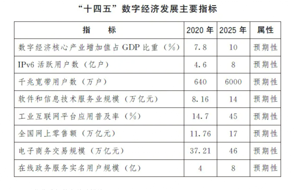 到2025年,数字经济迈向全面扩展期,数字经济核心产业增加值占GDP比重达到10%,数字化创新引领发展能力大幅提升,智能化水平明显增强,数字技术与实体经济融合取得显著成效,数字经济治理体系更加完善,我国数字经济竞争力和影响力稳步提升。
