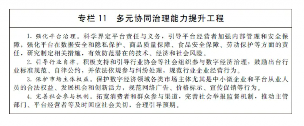 (三)完善多元共治新格局。建立完善政府、平台、企业、行业组织和社会公众多元参与、有效协同的数字经济治理新格局,形成治理合力,鼓励良性竞争,维护公平有效市场。加快健全市场准入制度、公平竞争审查机制,完善数字经济公平竞争监管制度,预防和制止滥用行政权力排除限制竞争。进一步明确平台企业主体责任和义务,推进行业服务标准建设和行业自律,保护平台从业人员和消费者合法权益。开展社会监督、媒体监督、公众监督,培育多元治理、协调发展新生态。鼓励建立争议在线解决机制和渠道,制定并公示争议解决规则。引导社会各界积极参与推动数字经济治理,加强和改进反垄断执法,畅通多元主体诉求表达、权益保障渠道,及时化解矛盾纠纷,维护公众利益和社会稳定。