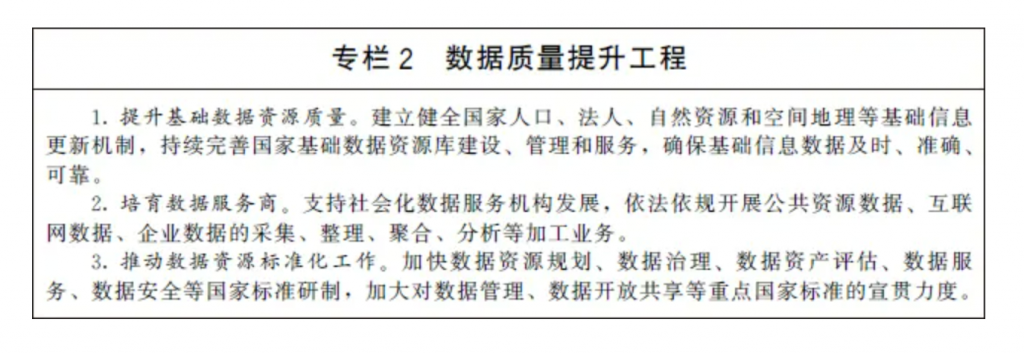 (一)强化高质量数据要素供给。支持市场主体依法合规开展数据采集,聚焦数据的标注、清洗、脱敏、脱密、聚合、分析等环节,提升数据资源处理能力,培育壮大数据服务产业。推动数据资源标准体系建设,提升数据管理水平和数据质量,探索面向业务应用的共享、交换、协作和开放。加快推动各领域通信协议兼容统一,打破技术和协议壁垒,努力实现互通互操作,形成完整贯通的数据链。推动数据分类分级管理,强化数据安全风险评估、监测预警和应急处置。深化政务数据跨层级、跨地域、跨部门有序共享。建立健全国家公共数据资源体系,统筹公共数据资源开发利用,推动基础公共数据安全有序开放,构建统一的国家公共数据开放平台和开发利用端口,提升公共数据开放水平,释放数据红利。
