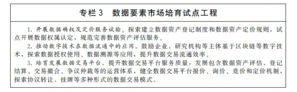 (二)加快数据要素市场化流通。加快构建数据要素市场规则,培育市场主体、完善治理体系,促进数据要素市场流通。鼓励市场主体探索数据资产定价机制,推动形成数据资产目录,逐步完善数据定价体系。规范数据交易管理,培育规范的数据交易平台和市场主体,建立健全数据资产评估、登记结算、交易撮合、争议仲裁等市场运营体系,提升数据交易效率。严厉打击数据黑市交易,营造安全有序的市场环境。