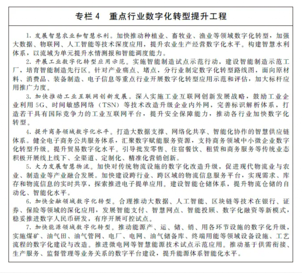 (二)全面深化重点产业数字化转型。立足不同产业特点和差异化需求,推动传统产业全方位、全链条数字化转型,提高全要素生产率。大力提升农业数字化水平,推进“三农”综合信息服务,创新发展智慧农业,提升农业生产、加工、销售、物流等各环节数字化水平。纵深推进工业数字化转型,加快推动研发设计、生产制造、经营管理、市场服务等全生命周期数字化转型,加快培育一批“专精特新”中小企业和制造业单项冠军企业。深入实施智能制造工程,大力推动装备数字化,开展智能制造试点示范专项行动,完善国家智能制造标准体系。培育推广个性化定制、网络化协同等新模式。大力发展数字商务,全面加快商贸、物流、金融等服务业数字化转型,优化管理体系和服务模式,提高服务业的品质与效益。促进数字技术在全过程工程咨询领域的深度应用,引领咨询服务和工程建设模式转型升级。加快推动智慧能源建设应用,促进能源生产、运输、消费等各环节智能化升级,推动能源行业低碳转型。加快推进国土空间基础信息平台建设应用。推动产业互联网融通应用,培育供应链金融、服务型制造等融通发展模式,以数字技术促进产业融合发展。