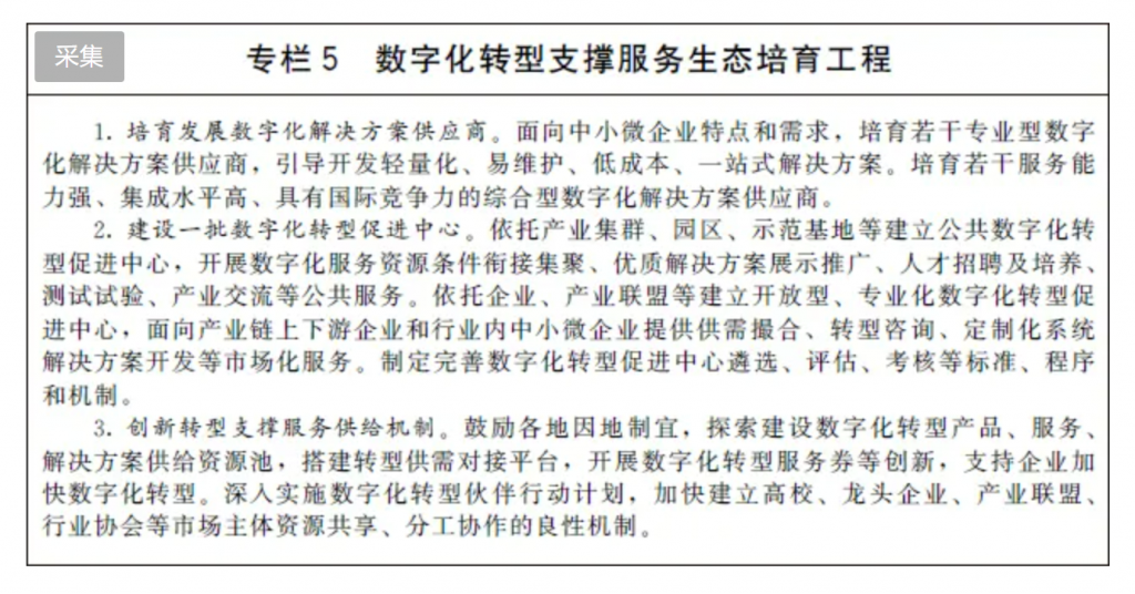 (一)加快企业数字化转型升级。引导企业强化数字化思维,提升员工数字技能和数据管理能力,全面系统推动企业研发设计、生产加工、经营管理、销售服务等业务数字化转型。支持有条件的大型企业打造一体化数字平台,全面整合企业内部信息系统,强化全流程数据贯通,加快全价值链业务协同,形成数据驱动的智能决策能力,提升企业整体运行效率和产业链上下游协同效率。实施中小企业数字化赋能专项行动,支持中小企业从数字化转型需求迫切的环节入手,加快推进线上营销、远程协作、数字化办公、智能生产线等应用,由点及面向全业务全流程数字化转型延伸拓展。鼓励和支持互联网平台、行业龙头企业等立足自身优势,开放数字化资源和能力,帮助传统企业和中小企业实现数字化转型。推行普惠性“上云用数赋智”服务,推动企业上云、上平台,降低技术和资金壁垒,加快企业数字化转型。