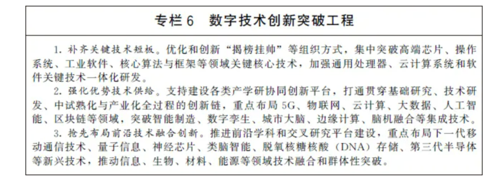 (一)增强关键技术创新能力。瞄准传感器、量子信息、网络通信、集成电路、关键软件、大数据、人工智能、区块链、新材料等战略性前瞻性领域,发挥我国社会主义制度优势、新型举国体制优势、超大规模市场优势,提高数字技术基础研发能力。以数字技术与各领域融合应用为导向,推动行业企业、平台企业和数字技术服务企业跨界创新,优化创新成果快速转化机制,加快创新技术的工程化、产业化。鼓励发展新型研发机构、企业创新联合体等新型创新主体,打造多元化参与、网络化协同、市场化运作的创新生态体系。支持具有自主核心技术的开源社区、开源平台、开源项目发展,推动创新资源共建共享,促进创新模式开放化演进。
