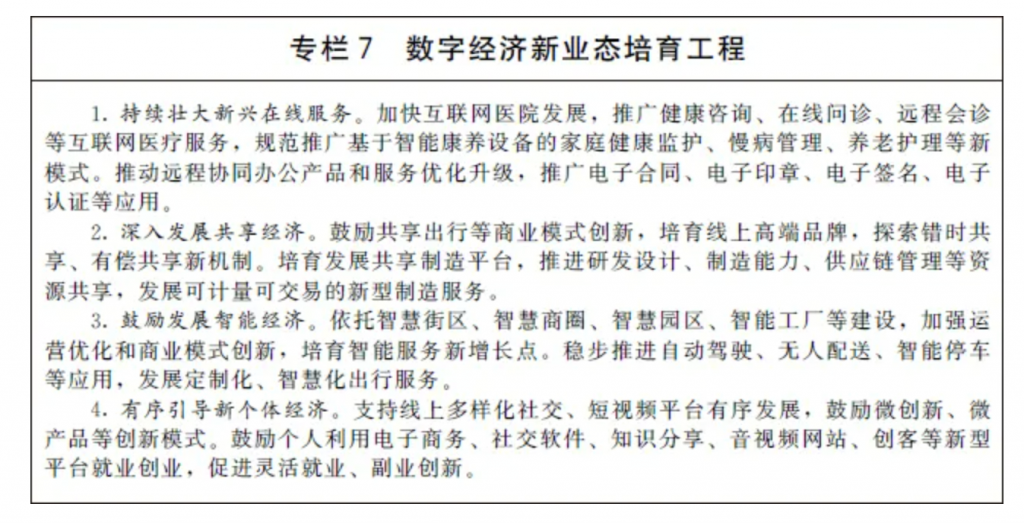(三)加快培育新业态新模式。推动平台经济健康发展,引导支持平台企业加强数据、产品、内容等资源整合共享,扩大协同办公、互联网医疗等在线服务覆盖面。深化共享经济在生活服务领域的应用,拓展创新、生产、供应链等资源共享新空间。发展基于数字技术的智能经济,加快优化智能化产品和服务运营,培育智慧销售、无人配送、智能制造、反向定制等新增长点。完善多元价值传递和贡献分配体系,有序引导多样化社交、短视频、知识分享等新型就业创业平台发展。