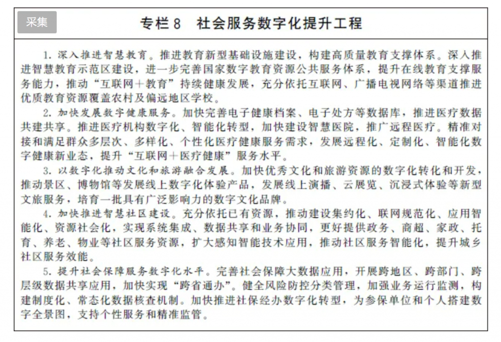 ——产业数字化转型迈上新台阶。农业数字化转型快速推进,制造业数字化、网络化、智能化更加深入,生产性服务业融合发展加速普及,生活性服务业多元化拓展显著加快,产业数字化转型的支撑服务体系基本完备,在数字化转型过程中推进绿色发展。