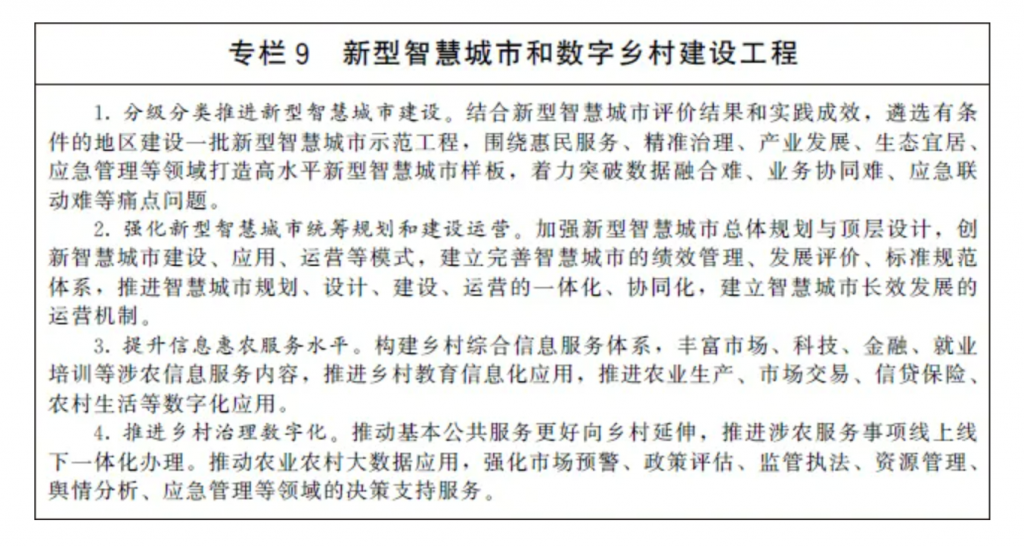 (三)推动数字城乡融合发展。统筹推动新型智慧城市和数字乡村建设,协同优化城乡公共服务。深化新型智慧城市建设,推动城市数据整合共享和业务协同,提升城市综合管理服务能力,完善城市信息模型平台和运行管理服务平台,因地制宜构建数字孪生城市。加快城市智能设施向乡村延伸覆盖,完善农村地区信息化服务供给,推进城乡要素双向自由流动,合理配置公共资源,形成以城带乡、共建共享的数字城乡融合发展格局。构建城乡常住人口动态统计发布机制,利用数字化手段助力提升城乡基本公共服务水平。