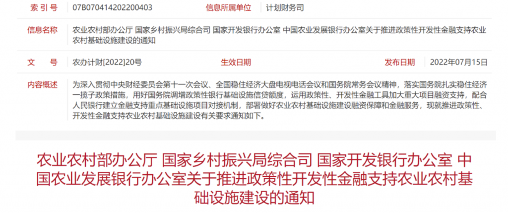 为深入贯彻中央财经委员会第十一次会议、全国稳住经济大盘电视电话会议和国务院常务会议精神,落实国务院扎实稳住经济一揽子政策措施,用好国务院调增政策性银行基础设施信贷额度,运用政策性、开发性金融工具加大重大项目融资支持,配合人民银行建立金融支持重点基础设施项目对接机制,部署做好农业农村基础设施建设融资保障和金融服务,现就推进政策性、开发性金融支持农业农村基础设施建设有关要求通知如下。