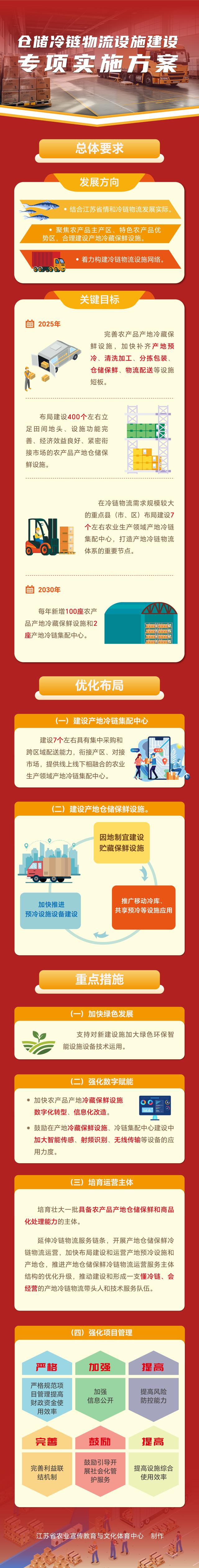 江苏省仓储冷链物流设施建设专项实施方案近日出台。方案结合江苏省情和冷链物流发展实际,以补短板、减损失、提品质、增效益为主攻方向,聚焦农产品主产区、特色农产品优势区,合理建设产地冷藏保鲜设施,提升技术装备水平,着力构建冷链物流设施网络,为服务乡村产业、提高农民收入、增强市场稳定性、保障农产品有效供给提供有力支撑。