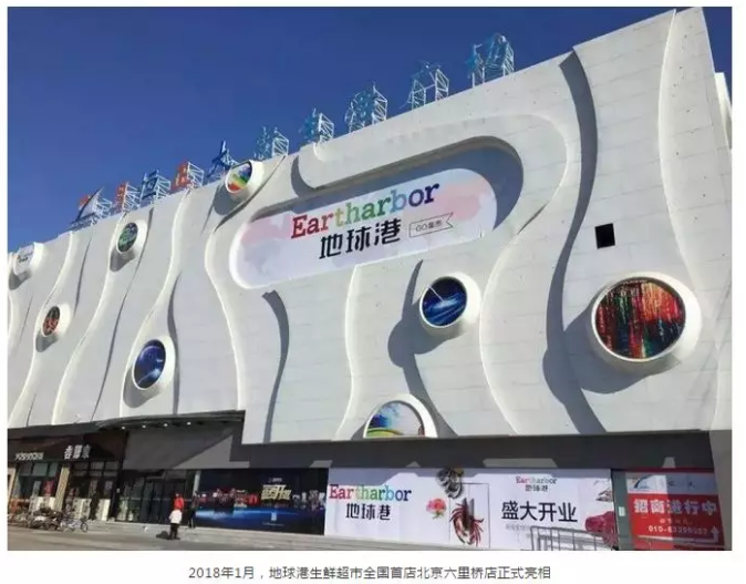 2018年1月,地球港生鲜超市全国首店北京六里桥店正式亮相,经营面积3000平方米左右,主打“精品超市+特色餐饮”,并且上线了地球港APP,服务周围3公里的线上用户,进一步实现线上线下的融合。
