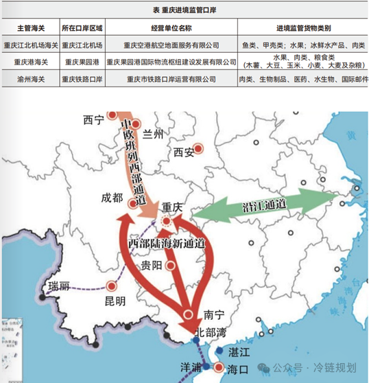 依托重庆肉类、果蔬、海鲜水产等监管口岸,借助西部陆海新通道与中欧班列、长江黄金水道,通过江海、铁海、公铁多式联运,可实现货物直达本地清关,