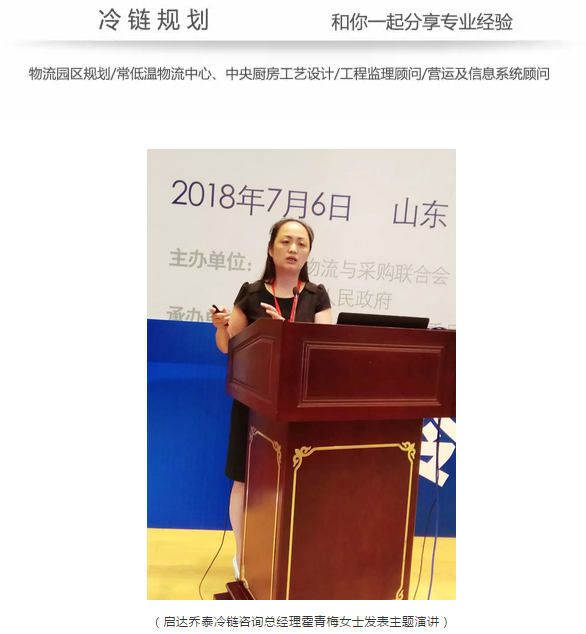 2018年7月6日,由中国物流与采购联合会和淄博市人民政府主办,淄博市物流产业发展办公室和《中国物流与采购》杂志社承办的“中国物流企业家夏季峰会”在山东省淄博市成功举办。国内冷链物流领域内知名的专业咨询服务机构——北京启达乔泰咨询有限公司应邀出席峰会,公司总经理霍青梅女士在峰会冷链物流平行论坛上发表演讲“构建共享生态模式的现代冷链物流园区”,引起了与会嘉宾的热烈反响。